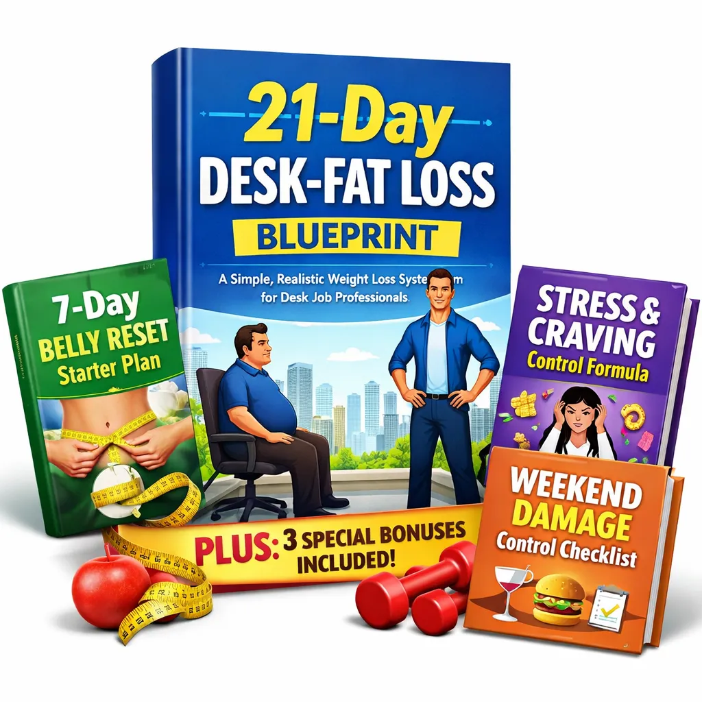 A science-based 21-day plan that melts desk fat with short office routines, focused nutrition hacks, stress-control techniques, and daily checklists. Built for busy schedules with fast wins and sustainable change — includes three bonus mini-plans.